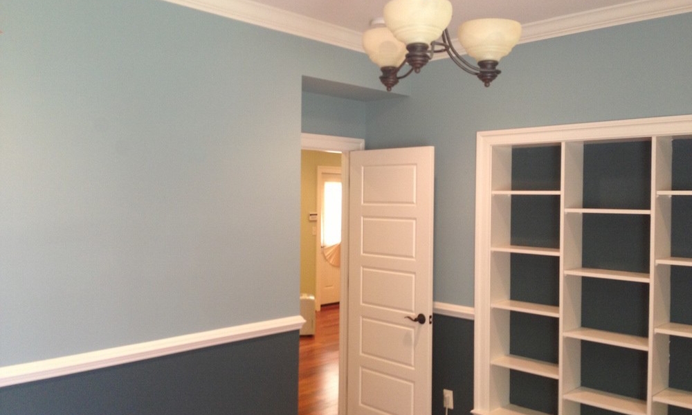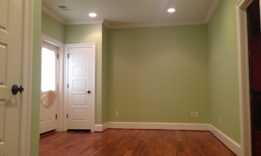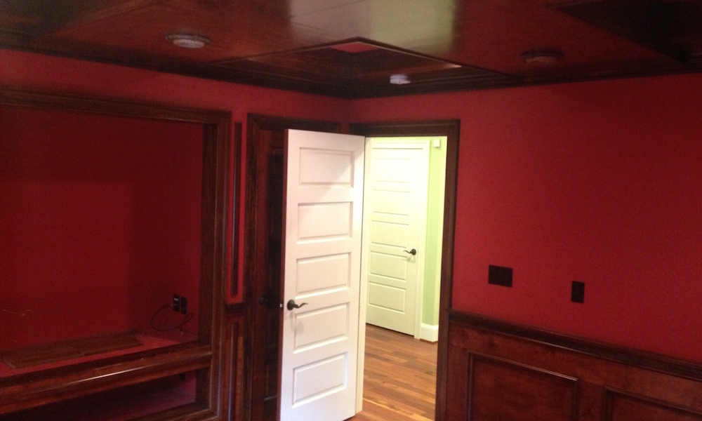 The 9′ ceilings were accented with crown molding, and glue-down tigerwood was installed on the floors. One of the bedrooms also doubled as a game room for the owner, a poker enthusiast. The features included a hand-stained coffered ceiling, and wood paneling around the lower half of the room. Two closets and a custom-build TV cabinet made for a rich and detailed finish.